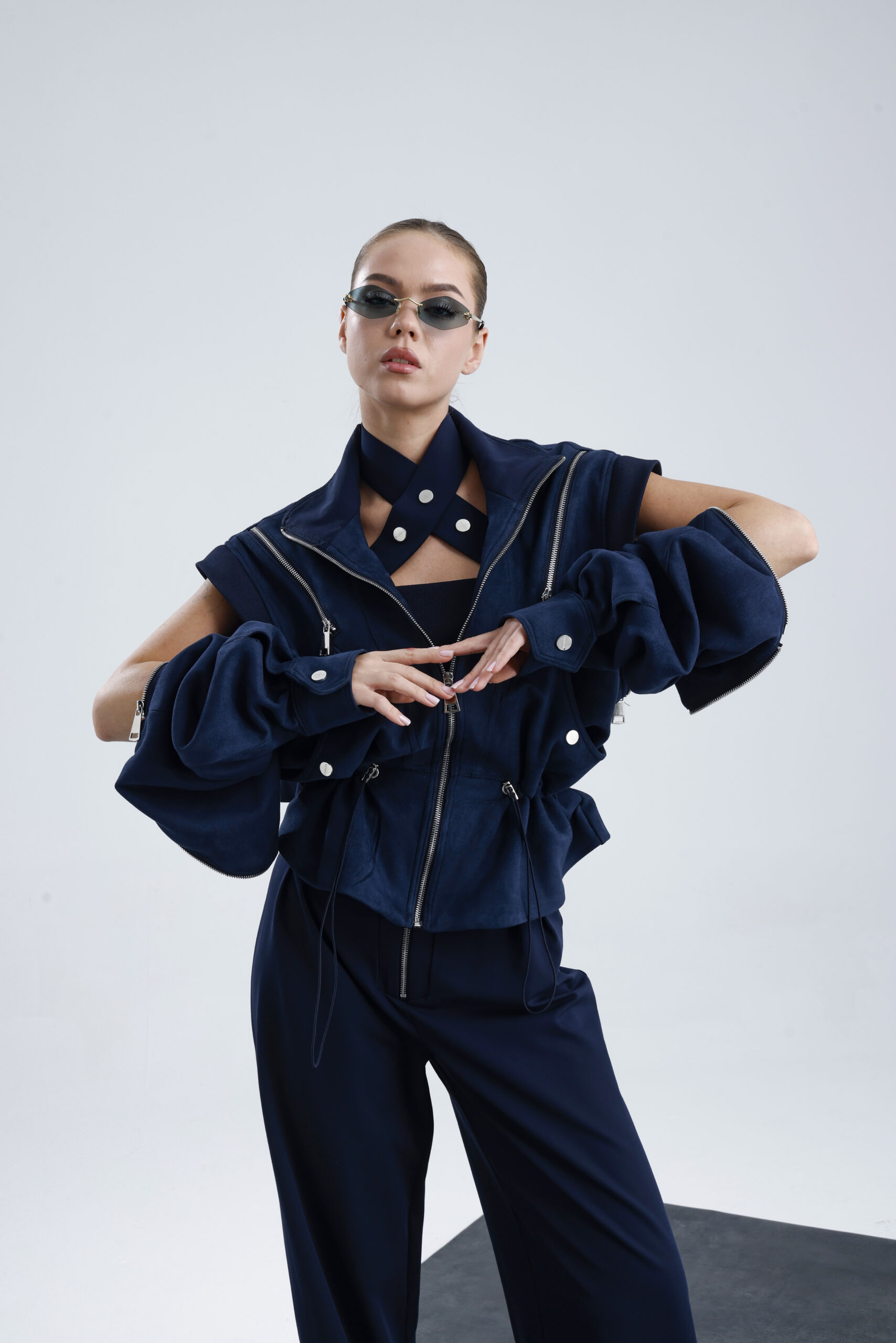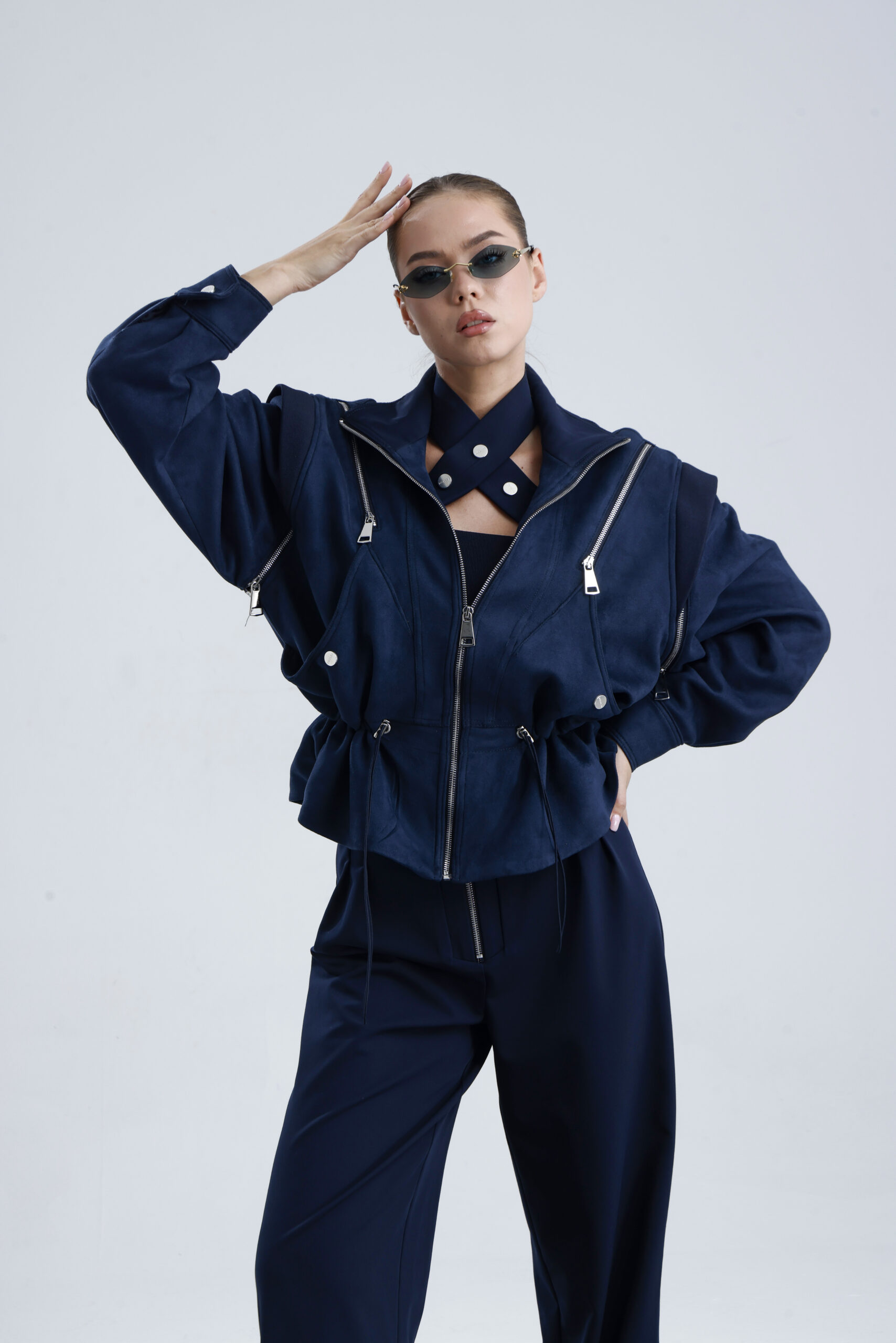 Suet kumaştan üretilmiştir, Fermuar kapalı,göğus zipperlı,kolar zipperla açılip yelek halindede kullanmaktadır