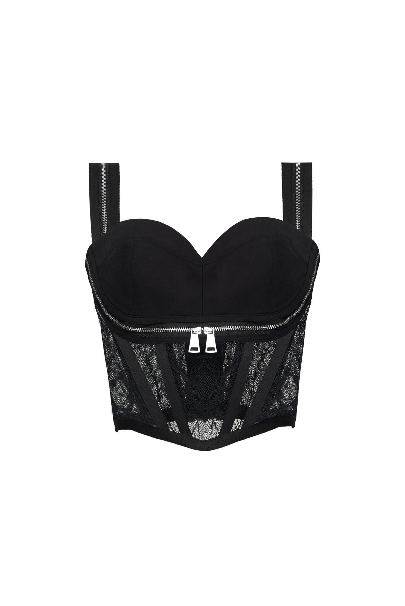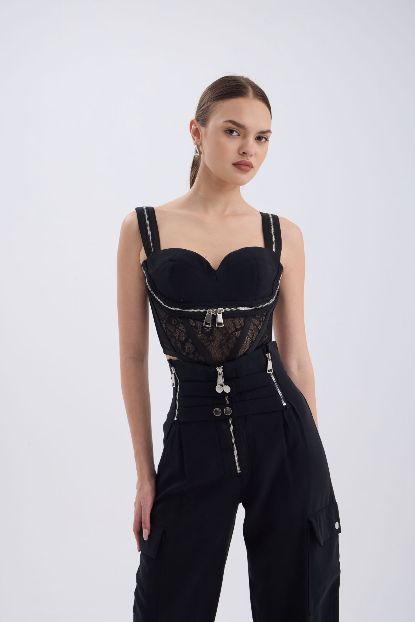 The top has lace detailing at the bottom, zipper detail at the front and shoulder, and zipper closure at the back. Model is wearing size S. Model measurements: Size: 36 | height: 1.82 cm | bust: 85 | waist: 62 | hips: 90
